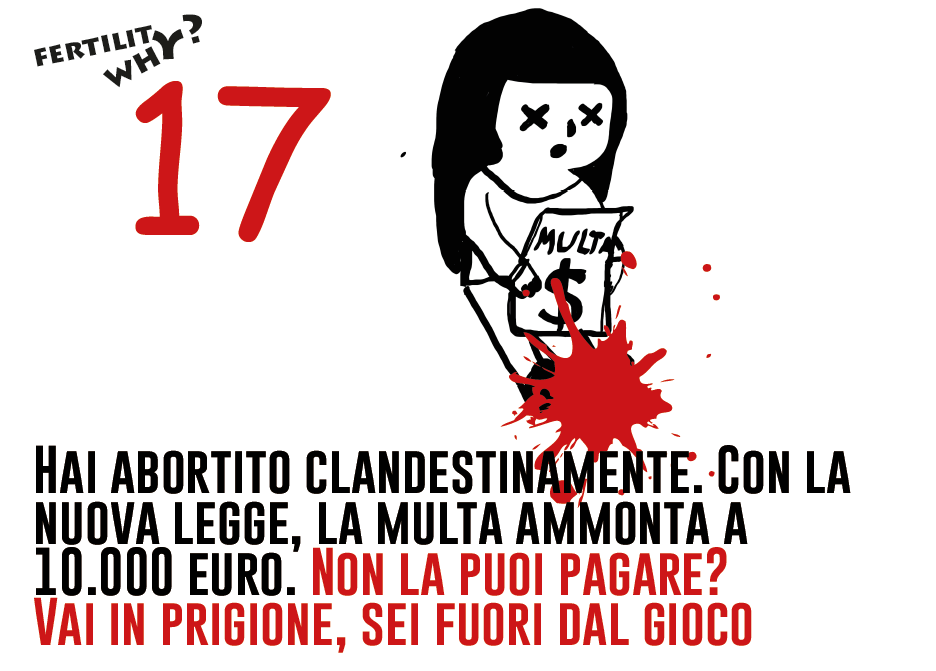 Lo scopo del gioco è far risaltare come siamo diventate soggettività incontrollabili, come i nostri desideri e le nostre scelte stiano già andando in direzioni molto diverse da quelle auspicate dal Piano Nazionale di Fertilità. Tuttavia il gioco vuole anche dimostrare che c’è un prezzo da pagare, che molti sono gli ostacoli che fronteggia chi intende vivere una vita non fascista. Se lanciamo i dadi e finiamo sulla casella numero 17 (Fig. 3), incontriamo una donna che ha abortito fuori dal Sistema Sanitario Nazionale e che per questo deve pagare 10.000 euro di multa [14].